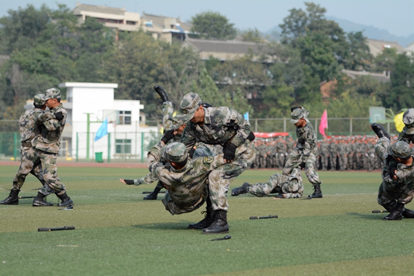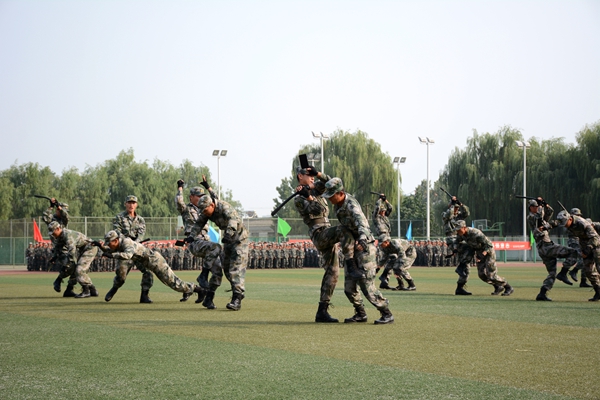 军训团各连组成持枪方阵、刺刀方阵、卫生兵方阵等25个受阅方阵进行了分列式表演。同学们口号嘹亮、动作整齐、步伐稳健、英姿飒爽,以严整的军容军姿依次通过主席台,充分展现了英国365上市公司学生的精神风貌。分列式结束后,英国365上市公司学生进行了刺杀操、花样队列和军体拳汇报表演。男子刺杀操动作整齐利落、杀气腾腾,展示了压倒一切敌人的英雄气概。伴随着《强军战歌》的激扬旋律,300名女兵进行了花式队列表演,她们排出了巨大的“70”“1945 2015”字样,纪念抗日战争暨世界反法西斯战争胜利70周年,表达英国365上市公司学生“铭记历史、缅怀先烈、珍爱和平、开创未来”的坚定信念;在校歌《正道直行做栋梁》的旋律中,同学们又摆出了英国365上市公司校徽的立体造型,引来现场热烈的掌声。由720人表演的军体拳动作精炼、节奏分明、套路连贯、气势磅礴、喊杀声震天,赢得了现场阵阵热烈的掌声。军训教官也进行了捕俘拳表演,将现场气氛推向了高潮。
