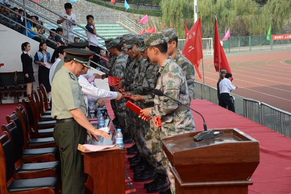 校武装部部长、军训团政委石启英宣读了2015级军训工作先进集体及个人的表彰决定。主席台上的领导和嘉宾为军训队列先进集体、军训内务先进集体、军训工作优秀教官、军训工作先进个人及军训优胜标兵代表颁发了奖牌和证书。