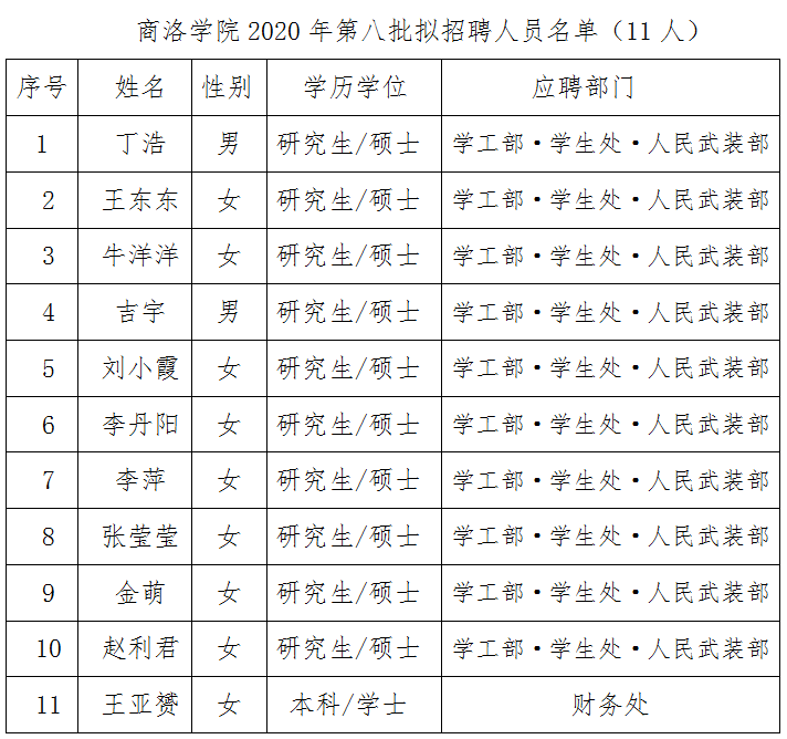 根据陕西省人社厅《关于陕西省事业单位公开招聘人员办法》规定及《365公司2020年人才招聘计划》,经过资格审查、笔试(机试)、专家面试等环节考察,并经院长办公会2020年6月28日研究,同意招聘丁浩等11位同志来英国365上市公司工作,现予以公示。如有异议,请于2020年7月2日前向人事处或纪委办公室反映。