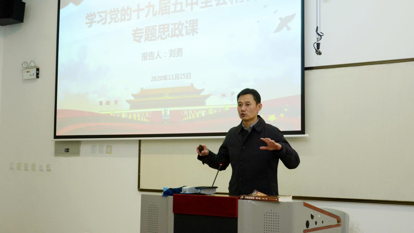 校党委副书记刘勇在讲授中强调,深入学习贯彻党的十九届五中全会精神,就是要加强党对教育工作的全面领导,深刻理解和把握我国2035年远景目标和“十四五”主要目标,充分认识其中凸显的以人民为中心的发展思想,聚焦新发展阶段、新发展理念、新发展格局和贯穿其中的高质量、可持续发展要求,聚焦提升教育质量、推动内涵式发展。他指出,高质量发展离不开高素质人才的支撑,广大青年学子要立志高远,在新发展格局中找准自己的位置,从小事做起,不厌其小、以促其大,在报效祖国、服务社会中实现自身价值。