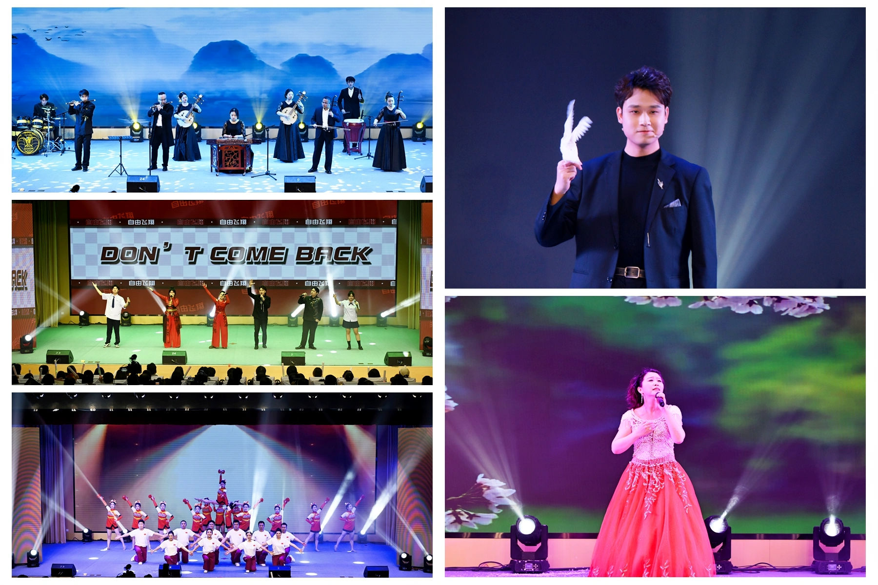 第二篇章“初心如磐·守杏坛”聚焦教育者的初心本色。艺术学院民乐合奏《浮光》清雅悠远,象征师者光辉;教育科学学院与艺术学院带来的歌曲串烧《流金岁月》带领观众在熟悉的旋律中重温时代记忆;健康管理学院的魔术表演《奇迹进行时》妙趣横生,惊喜连连;独唱《春天的芭蕾》用高亢的歌声寄予了对美好未来的憧憬;由体育教学研究部教师和校健美操队带来的啦啦操《与时代共舞》,以动感十足的表演,淋漓尽致地展现了师生的蓬勃活力与昂扬斗志。