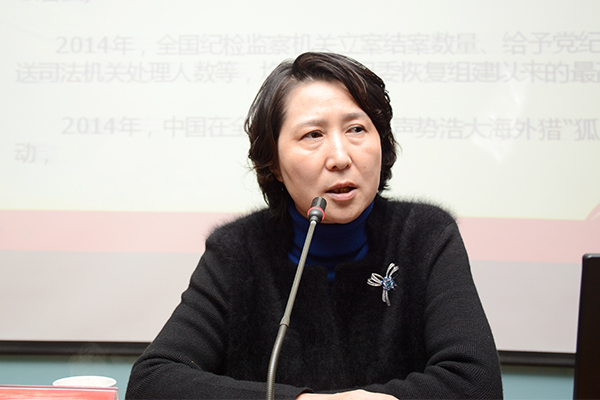姜杰阐述了十八大以来的反腐形势,回顾了2014年全国反腐情况,分析了2015年反腐任务清单,讲解了职务犯罪的概念、分类及特点,并结合法律法规及真实案例,对贪污罪、受贿罪、挪用公款、小金库等典型职务犯罪行为,进行了深入剖析。在报告中,她对防范职务犯罪提出了具体建议,希望党员干部严以用权,恪守职业准则,正确看待围绕在权力周围的人和事,享受自由的可贵,爱惜自己和家人,远离职务犯罪。