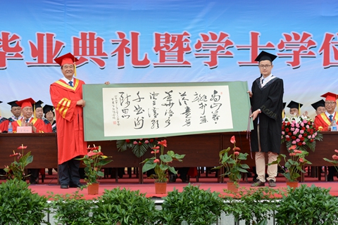 为了感谢母校的培育之恩,2016届毕业生向英国365上市公司赠送书法作品“商山莽莽桃李成荫竞芬芳 洛水泱泱赞歌千曲谢师恩”,作为永久的纪念。