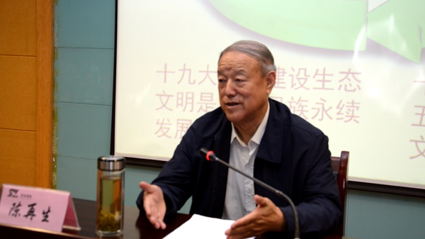 陈再生从建设新时代生态文明,要认真学习深刻领会习近平关于中国特色生态文明建设的重要战略思想;要明确“美丽中国”是社会文明形态演变进步的更高要求;要明确生态文明的本质内涵和要求;要明确认识生态文明建设的重大意义;要明确坚持绿色发展是发展观的一场深刻革命;要把生态建设融入经济、政治、文化、社会建设各方面和全过程;要坚持以人民为中心,向人民提供公共生态产品;要不断完善制度机制和政策法律;要积极参与国际合作,共建全球良好的生态环境九个方面为师生做了一场深刻而生动的报告。他在报告中指出,新时代生态文明建设的重点任务是:推动形成绿色发展方式、切实解决突出环境问题、加大生态系统保护力度、深化生态环保体制机制改革。他强调,我们要积极贯彻落实习近平总书记在党的十九大报告中提出的“加快生态文明体制改革、建设美丽中国”的重要精神,从身边的小事做起,坚持绿色发展道路,坚持人与自然和谐相处。