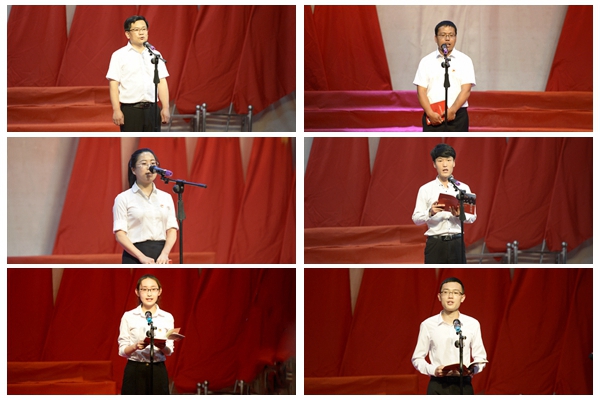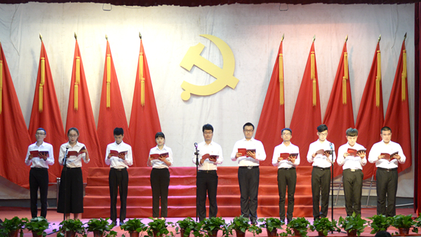 教职工党员代表集体诵读了《梁家河》中的《修身》,学生党员代表集体诵读了《走进新时代》篇章。