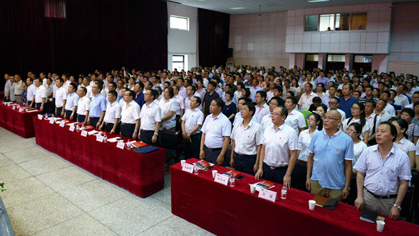 会场气氛隆重热烈,党旗鲜艳高扬,党徽熠熠闪光,师生精神饱满。大会伊始,全体起立,高唱国歌。激昂的旋律、洪亮的歌声响彻会场。