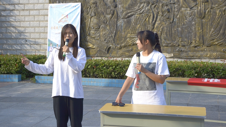 人文学院学生代表王滢在表态发言中呼吁全体学生要规范使用普通话,让规范语言之花开遍美丽的校园。学生朱怡宁、丁欣玉为大家表演了相声《普通话》,通过生动有趣的表演向展示了不良语言习惯及普通话的别样韵味,切实增强了大家的语言规范意识。王林等学生向大家朗诵了红色诗歌《永远跟党走》,带领大家重温了先辈们浴血奋战的革命岁月,让大家在诗歌中感悟党的峥嵘岁月,体会语言的动人魅力。