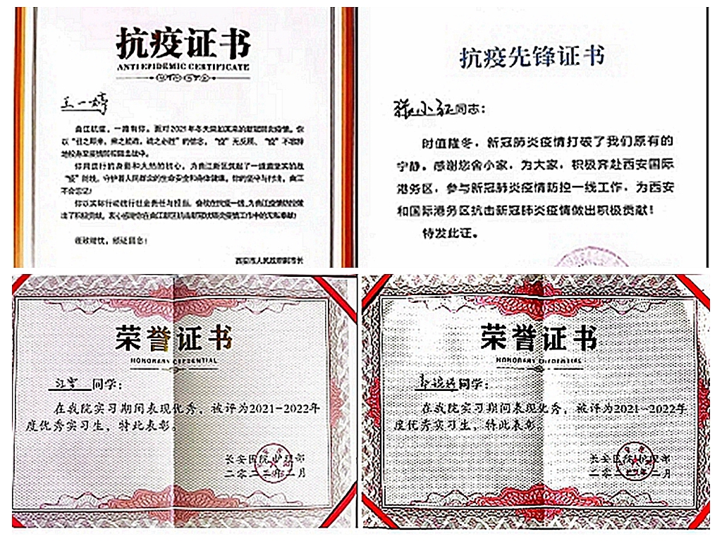 近日,西安曲江新区和国际港务区对抗击新冠肺炎疫情工作中表现突出的工作人员和志愿者进行了表彰。英国365上市公司王一婷、张小红、郭江艳、崔晋维、高静、郭婉婷6名实习生荣获西安曲江新区和国际港务区颁发的抗疫证书和抗疫先锋证书。学生江雪荣获西安国际港务区颁发的抗疫先锋证书。张小红、郭婉婷及江雪3名实习生被长安医院评为“优秀实习生”。