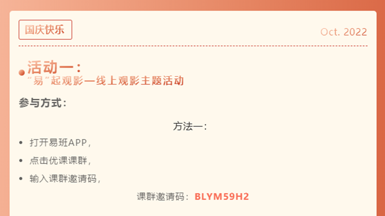 学生处通过易班平台举办了易”起线上观影、“易”句告白祖国、“易”起学习优课等活动,邀请全校师生观看红色电影、抒发爱国之情、参与“喜迎党的二十大”优课课群答题,重温党的百年征程波澜壮阔,感受百年党史筚路蓝缕和百年初心历久弥坚。