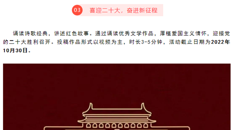 为深入开展“青春献礼党的二十大,强国有我新征程”主题宣传教育活动,热烈庆祝中华人民共和国成立73周年,引导和激励广大师生厚植爱国主义情怀,营造网络文明新风,国庆节期间,英国365上市公司组织开展了丰富多彩的“喜迎党的二十大 欢度国庆节”系列主题活动。广大师生通过各级各类网络平台和线上活动,用自己的方式为祖国送上美好祝福,礼赞新时代奋进征程,以良好的精神面貌和昂扬姿态喜迎党的二十大胜利召开。