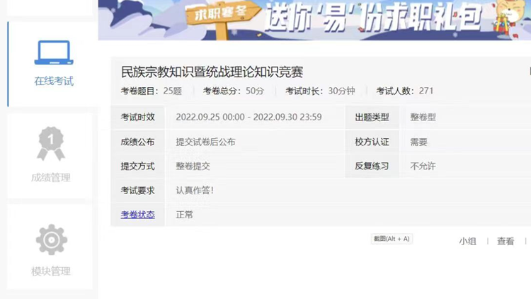 健康管理学院在易班APP上开展了民族宗教知识暨统战理论知识竞赛,全院所有新生均参与答题,进一步提高新生对习近平总书记关于民族团结进步重要论述、民族政策法规、民族基本常识等内容的掌握。生物学院在易班APP上开展了以“迎华诞,学党史”为主题的党史知识竞赛,同时在“学习大国”微信公众号上参与民族宗教知识竞赛暨统战理论知识竞赛,全院师生积极参与,答题率高达90%,提高了活动知晓度和普及率。