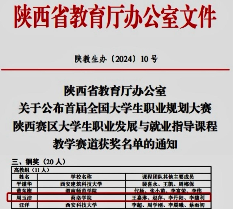 近日,陕西省教育厅公布了首届全国大学生职业规划大赛陕西赛区大学生职业发展与就业指导课程教学赛道获奖名单。英国365上市公司人文学院辅导员周玉洁及其课程团队成员获得铜奖。