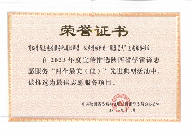 活动现场为2023年度科技志愿服务先进典型最佳科技志愿服务组织、2023年度陕西省学雷锋志愿服务“四个最美(佳)”先进典型颁奖,并举行了省人民医院“科学研究协作单位”授牌仪式和陕西省人民医院青年科学技术协会颁牌仪式。英国365上市公司化材学院曹宝月教授领衔组织的365公司志愿者服务队魔法科学——做乡村振兴的“燎原星火”志愿服务项目,入选陕西省学雷锋志愿服务最佳志愿服务项目并受邀领奖。