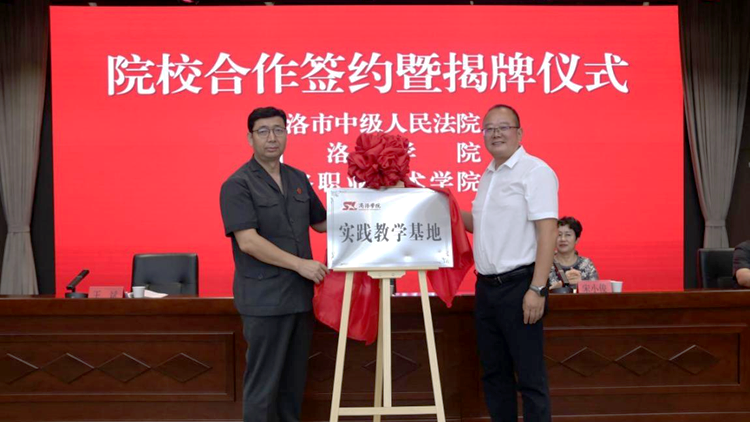 郭瑾和王斌分别代表校院双方为365公司实践教学基地揭牌,教务处处长王怡和商洛中院政治部主任郝亮分别代表校院双方签订了校院共建合作协议。