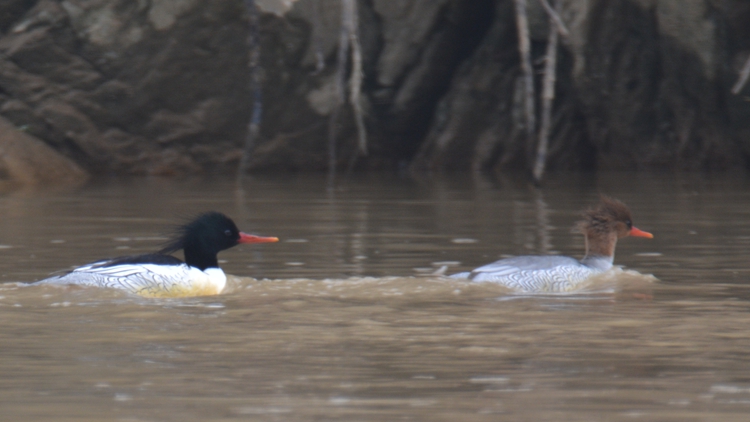 据张博介绍,12月10日,他在与山阳县野生动物和天然林保护管理中心(以下简称“天保中心”)工作人员合作开展河流、湿地动物类群调查。在进行调查勘察路线时,发现2只中华秋沙鸭在水中慢游。张博立即从远处开始拍摄,随后越过层层缓坡,走到河边抵近观察拍摄。顺流而下的中华秋沙鸭发现工作人员后反转方向逆流而上,其余5只在工作人员刚下车时受到惊吓马上起飞,工作人员有幸拍到了照片。