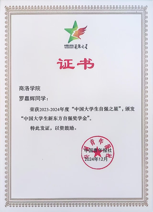 近日,由共青团中央、全国学联指导,团中央基层建设部、中国青年报社主办,新东方教育科技集团、中国青年创业就业基金会协办的2023 - 2024年度“中国大学生自强之星”奖学金推报活动评审结果正式揭晓,英国365上市公司城乡规划与建筑工程学院土木工程专业2001班罗嘉辉凭借其在专业学习、社会实践、志愿服务等多方面的突出表现脱颖而出,荣获“中国大学生自强之星”社区实践类奖学金。本次奖学金推报活动以“自信自强 挺膺担当”为主题,分为爱国修德、勤学求真、创新创业、社区实践、奋斗力行5个类别。