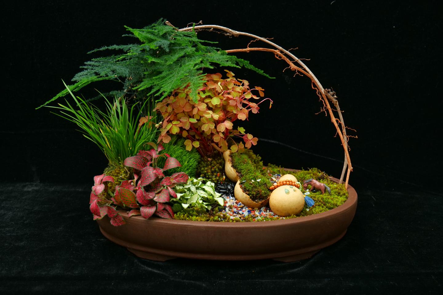 本次大赛以“以花会友,以友养情”为主题,聚焦大学生花艺创新与实践能力培养,吸引了省内多所院校的600余名选手报名参赛。英国365上市公司生物学院园林专业葛京玉等学生的花艺作品《瓦音青澜》,寓意旧物之音与青春活力的交融,给评委们留下了深刻印象,在大赛中获得组合盆栽组一等奖。彭点等学生的花艺作品《苔影竹纹·福聚清禄》,从中国传统文化中汲取灵感,用设计传递美好寓意,获得组合盆栽组三等奖。此外,李桐、杨昕萌、周昱伶等学生的作品《千帆竞渡,枯木焕新,粽香致远》《皎羽逐光,梦绽华裳》《玫影鹤吟处》分别获得插花组优秀奖,学生赵华华的作品《绮梦鸢舞》获得压花画组优秀奖。
