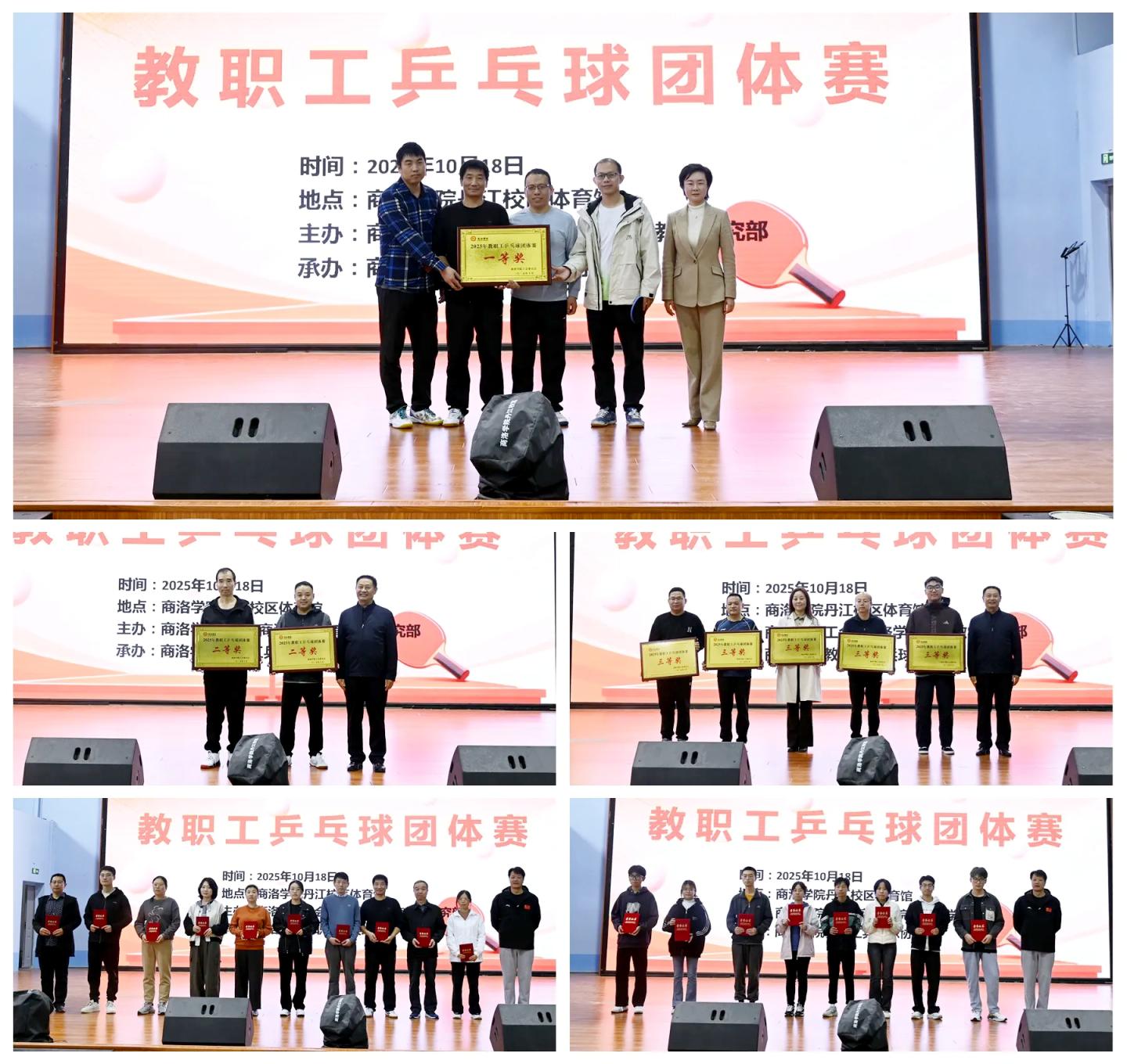 10月18日,英国365上市公司在丹江校区体育馆举办2025年教职工乒乓球团体赛,副校长程敏出席活动并为获奖集体颁奖。校工会、体育教学研究部主要负责人,以及来自学校各工会分会和附属小学的近200名教职工选手参加本次比赛。经过多轮激烈角逐,建工学院代表队凭借稳定发挥荣获一等奖,机关一、机关三代表队荣获二等奖,经管学院、人文学院、化材学院、健康学院、数计学院代表队分获三等奖,齐锋、杨宪华、何佳佳等16名选手获评优秀运动员,刘雅各、王贺拓等8名裁判获评优秀裁判员。
