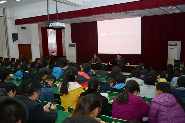 保卫处副处长房喜峰主持培训会,校内各单位消防安全员、实验员、消防控制室工作人员、机房管理员、公寓楼层服务员、食堂经理及安全管理人员、辅导员、2015级各班安全委员或班长、校卫队员和学生护校队员等230多人参加了培训。