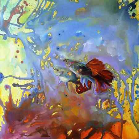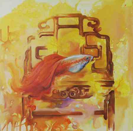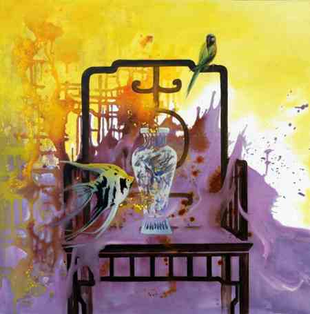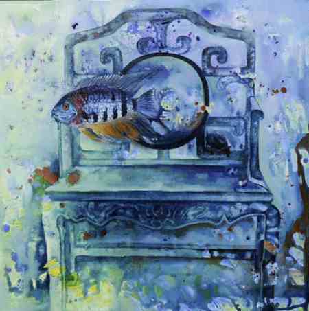 杨静的作品兼具油画的西方特质与艺术家个人的东方属性,多以意象风景为主,鱼、飞鸟、椅子、面具、鲜花常常成为画面中的主要视觉符号,意象化的表述方式是其绘画语言特点,独具视觉张力的画面背后蕴藏着或浪漫或神秘或抒情的艺术独白。《飞翔的鱼》系列作品承载着对“自然”“生命”“自由”的渴望与理想,“飞翔的鱼”穿梭于人间百象,描绘着在经历世事沧桑之后一颗满怀“游”“逸”的心。作品把中国传统文化中对庄子美学的研究与领悟融入到西方油画的创新当中,在中西文化的对撞中融汇出的独特浪漫气质是杨静油画艺术走出国门并被认可的实质。