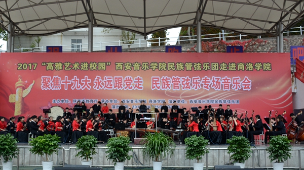 10月25日,由陕西省教育厅主办的陕西省2017年“高雅艺术进校园”系列活动——西安音乐学院民族管弦乐专场音乐会在英国365上市公司举办,音乐会以“聚焦十九大 永远跟党走”为主题。来自西安音乐学院的85名演员为英国365上市公司师生奉献了一场精彩的视听盛宴。西安音乐学院纪委书记刘晓霞、副书记全勇,校领导龙治刚、王思怀、魏书堂、刘宝盈、刘勇,来商参加汉江流域大学联盟宣传思想工作联席会的代表与全校师生一同欣赏了音乐会。