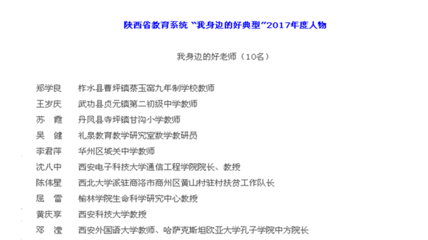 苏霞等10名教师获“‘我身边的好典型’2017年度好老师”荣誉称号,铜川市王益区黄堡镇逸夫小学校长崔会婷等8名同志获“‘我身边的好典型’2017年度好校长(园长) ”荣誉称号,陕西省自强中等专业学校颜学谦等18名学生获“‘我身边的好典型’2017年度好学生 ”荣誉称号。