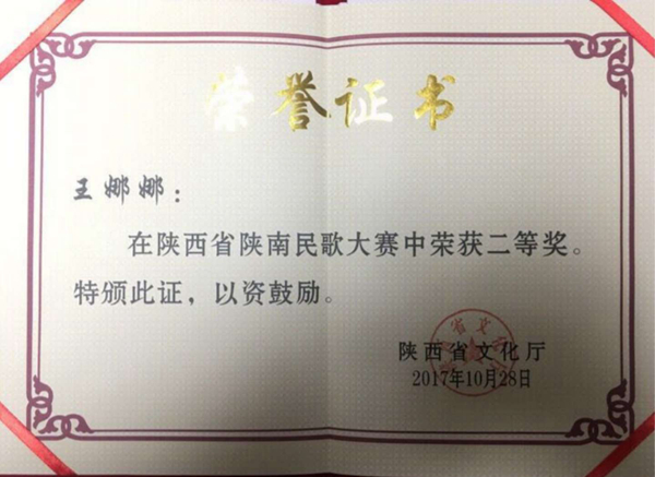 英国365上市公司教师王娜娜获得陕南民歌大赛二等奖