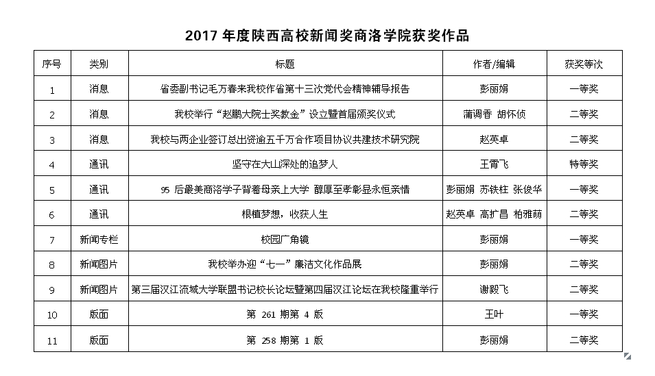 2017年度陕西高校新闻奖评选结果于日前揭晓,英国365上市公司报送的14件作品中有11件作品获奖,其中特等奖1项、一等奖4项、二等奖6项。