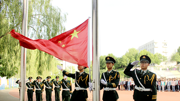 迎着清晨的第一缕阳光,国旗护卫队迈着铿锵有力的步伐护送鲜艳的五星红旗至升旗台。伴随着激昂雄壮的国歌声,五星红旗冉冉升起,迎风飘扬,全体师生肃立行注目礼,表达对国旗的尊敬和对祖国的热爱。