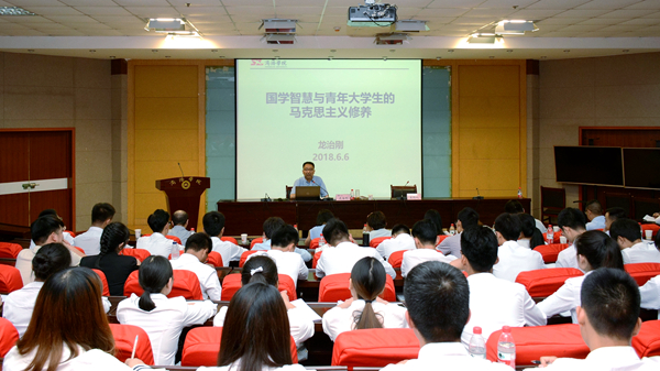 龙治刚从狭义和广义两个角度为同学们讲解了国学的含义,并以四部分类法对国学进行分类,简要介绍了《经》《史》《子》《集》各部的主要内容。他引用邓卫东的国学史观,结合自己的亲身感受,从不同侧面,用生动的事例、精辟的语言全方位阐述了“自然国学,生命国学,家庭国学,公益国学”。他以孔子的人生经历为背景,重点讲述了儒家思想“仁”“礼”“中庸”“义”“信”的深刻内涵,点面结合,将中国传统思想文化里的国学智慧娓娓道来。此外,龙治刚还从修身之道、廉政之道、法治之道、民本之道等七个方面入手,结合儒释道文化起源和核心思想,巧妙地将优秀传统文化、现代教育理念、当代青年的马克思主义修养融贯一体,以生动有趣的语言引领青年大学生了解中国优秀传统文化中的思想精华,引导青年学子树立正确的世界观、人生观和价值观。