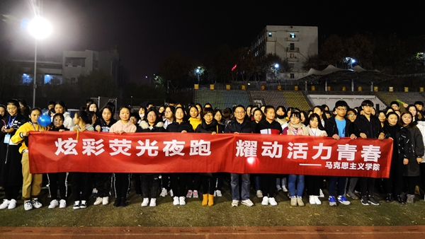 ——荧光夜跑活动。11月26日晚,马克思主义学院在学校操场举办以“炫彩荧光夜跑,耀动青春活力”为主题的夜跑活动,200多名师生参加了此次活动。活动开始后,师生们手带荧光环、挥舞荧光棒,在慢跑中欣赏夜色中的校园,用自己的青春和活力为校园增添靓丽风景。夜跑结束后,大家还一起进行了有趣的互动游戏,在欢乐的氛围中享受运动的乐趣,增进彼此的友谊。