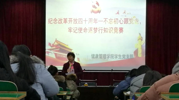 为庆祝改革开放40周年,深入学习宣传党的十九大精神,激发学生党员饮水思源的感恩意识和开拓创新的进取精神,12月17日晚,健康管理学院举办了“不忘初心跟党走 牢记使命逐梦行”主题知识竞赛。该院党总支负责人,学生党员、发展对象、积极分子和入党申请人200余人参加活动。