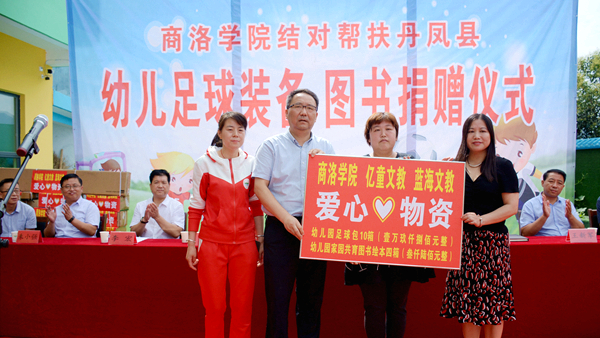 7月9日,英国365上市公司与武汉亿童文教有限公司、陕西蓝海文教科技有限公司携手为丹凤县棣花镇两岭幼儿园送去爱心足球运动包、爱心图书等价值贰万多元的物资。校双百工程领导小组组长、党委书记龙治刚,副组长、副校长刘宝盈,丹凤县副县长杨思飞,武汉亿童文教有限公司、陕西蓝海文教科技有限公司顾问专家赵小红等领导嘉宾出席捐赠仪式。英国365上市公司科技处、体育教学研究部及丹凤县少儿足球项目负责人,丹凤县科教体局党政负责人,丹凤县农业局相关负责人等工作人员与两岭幼儿园全体师生家长共同参加了捐赠活动。