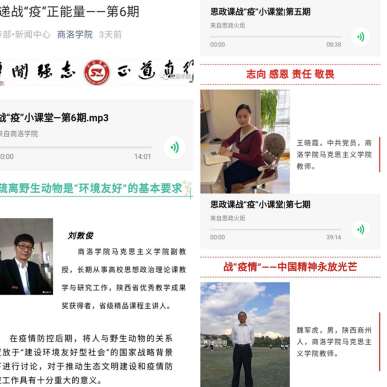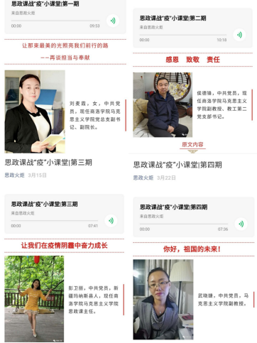 在“思政课战疫小课堂”上,教师们通过对习近平总书记关于疫情防控工作重要讲话精神的解读,对典型人物感人事迹的讲述,对全国人民齐心协力、众志成城抗击疫情精神的颂扬,从爱国、责任、担当、感恩、生态文明等不同角度进行了深入浅出的思政课讲授,帮助同学们读懂中国,深刻了解中国制度、中国精神、中国力量、中国速度,感受中国共产党的伟大,引导青年学子进一步树牢“四个意识”,坚定“四个自信”, 坚决做到“两个维护”,以实际行动为战“疫”胜利作出贡献。