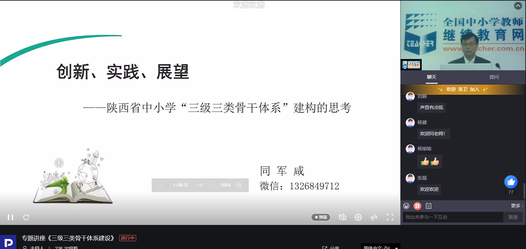 开班典礼后,沈善良为学员在线上作了《县级培训者团队研修项目政策解读》专题报告,当天下午,陕西教育科学研究所教研室主任同军咸为学员作了题为《三级三类骨干体系建构》的讲座。