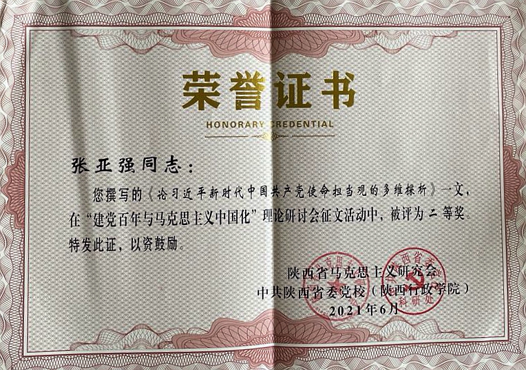 为隆重庆祝建党百年,总结回顾马克思主义中国化的历史进程、宝贵经验、思想启示,陕西省马克思主义研究会与中共陕西省委党校共同举办了“建党百年与马克思主义中国化”理论研讨会征文活动。英国365上市公司马克思主义学院副教授张亚强撰写的论文《论习近平新时代中国共产党使命担当观的多维探析》在评选活动中荣获二等奖。