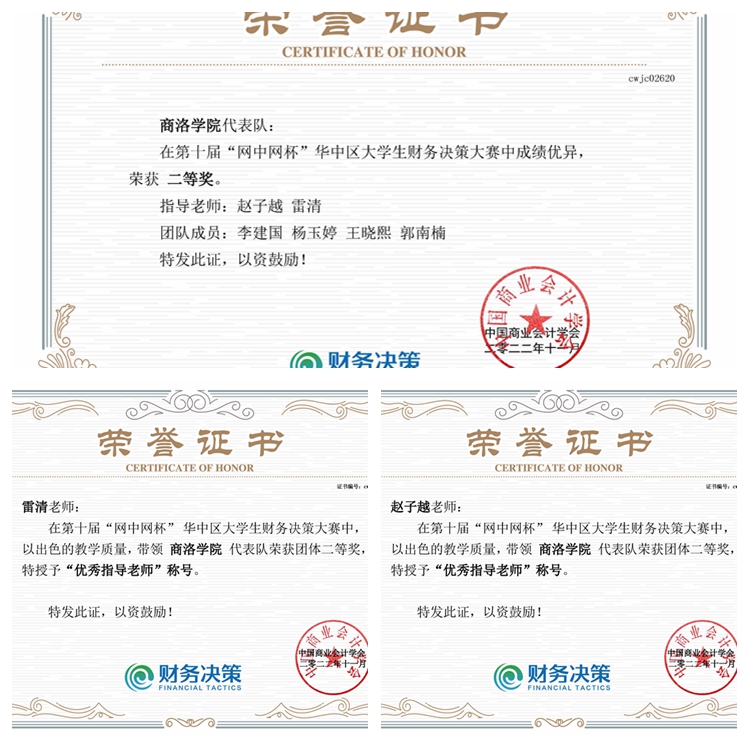 第十届“网中网杯”大学生财务决策大赛由中国高等教育学会高等财经教育分会指导,中国商业会计学会主办,厦门网中网软件有限公司等单位提供技术支持,全国共有372所本科院校参赛。英国365上市公司经济管理学院李建国、杨玉婷、王晓熙、郭南楠4名学生获得华中区团体二等奖,雷清、赵子越荣获“优秀指导教师”称号。