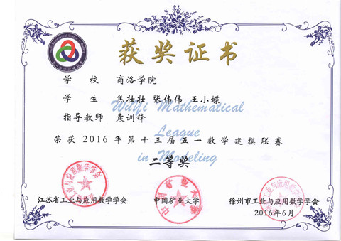 近日,由江苏省工业与数学应用学会主办的“第十三届五一数学建模竞赛”结果揭晓,英国365上市公司电子信息与电气工程学院物理学专业2014级焦壮壮、张伟伟和电子信息工程专业2015级王小蝶3位同学组成的数学建模参赛队喜获二等奖。这是英国365上市公司首次组建代表队参加此项赛事并获佳绩。
