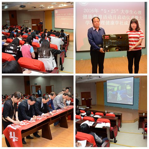 学生处处长石启英宣布英国365上市公司2016年“5·25”大学生心理健康教育活动月正式开幕,并为大学生心理健康学社授牌。