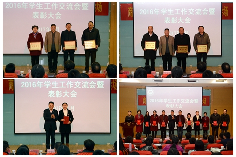 大会对2015-2016年度省级优秀辅导员赵萍,生物学院等3个2016年学生工作考核先进集体、鲁绵茸等11名学生工作先进个人、李嫱等29名优秀班主任,经管学院等3个就业工作先进集体、王正良等13名就业工作先进个人,张俊华撰写的《建国以来青少年偶像崇拜问题的基本脉络及其思考》等16篇学生工作研究优秀论文,李馥利等30位辅导员、班主任的优秀学生工作日志进行了表彰。在热烈的掌声中,范新会、彭虎军为获奖集体和个人代表颁发了奖牌、证书。在校学生代表为优秀班主任颁发了证书。
