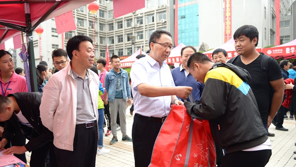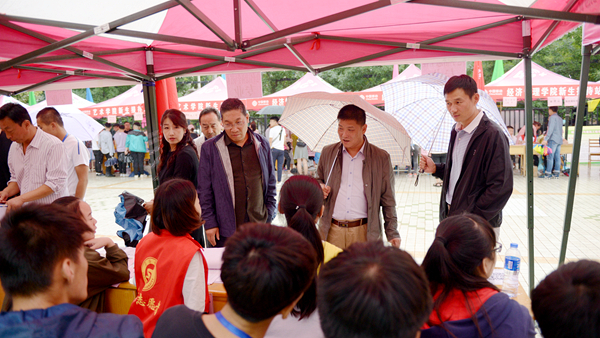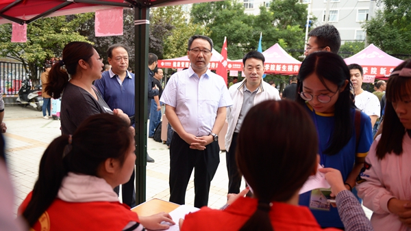龙治刚、范新会、彭虎军、刘勇分别深入交费处、绿色通道、行李寄存处、卧具发放处、军训服装发放处、银行卡与通信卡办理处和各二级学院新生报到接待处等场点,巡查迎新工作开展情况,走访慰问工作人员和学生志愿者,与新生家长交谈。