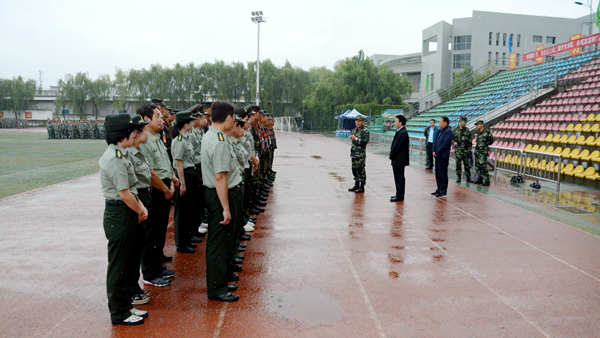 在军训场地,连文生大校对承训教官和参训学生在连日阴雨中依然坚持刻苦训练的坚强意志和顽强作风表示赞赏。他逐一视察各连方阵,看望慰问承训教官、参训师生,详细了解了连队编排、训练项目等各方面工作开展情况。他要求承训教官,一要严格施训,认真组训,确保新生军训效果;二要通过军训,增强学生体魄,磨炼学生的坚强意志,锻造学生的优良品质;三要严格保证训练质量,确保学生安全。他希望2018级学生通过军训,进一步增强国防意识和爱国情操,培养艰苦奋斗、吃苦耐劳的作风,圆满完成训练任务,以饱满的热情和良好的精神面貌开启大学生活。