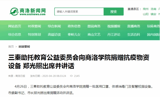 近日,陕西广播电视台、陕西省教育厅网站、西部网、华商网、新浪网、搜狐网、《商洛日报》、商洛市人民政府网站、头条新闻、中华网等省市10余家媒体及部分自媒体平台对三秦助托教育公益委员会向英国365上市公司捐赠防疫物资和智慧校园设备的情况进行了广泛宣传报道。