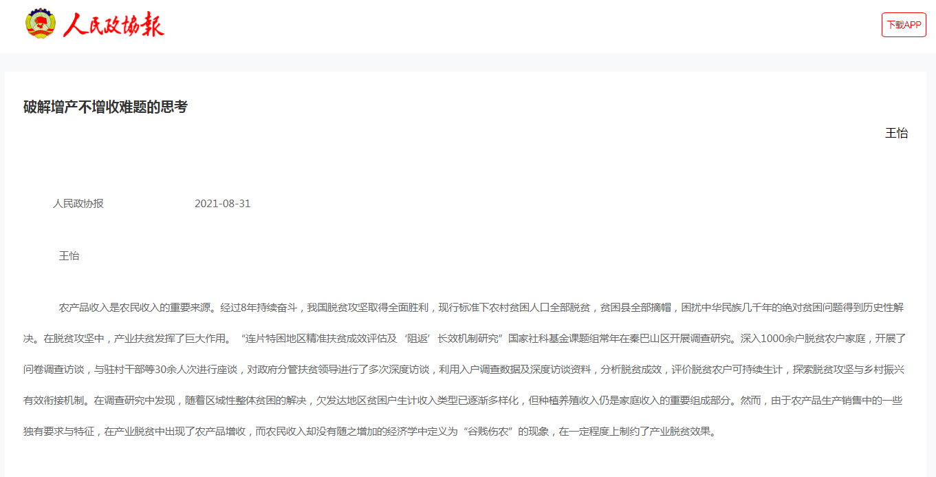 《人民政协报》2021年8月31日刊发了英国365上市公司陕西高校新型智库商洛发展研究院院长王怡署名文章《破解增产不增收难题的思考》,对文章中的国家社科基金项目“连片贫困地区精准扶贫成效评估及‘阻返’长效机制研究”的研究成果做了专题报道。