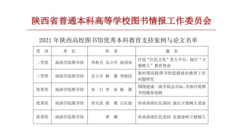 由陕西省高校图工委主办的“2021年陕西高校图书馆本科教育支持案例与论文大赛”结果于日前揭晓,图书馆馆员李秋月获二等奖,员立亭获三等奖,朱白、李火苗和曹娜等人获优秀奖。