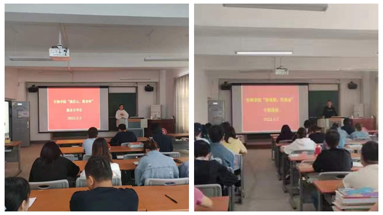为进一步做好2022届毕业生就业创业工作,持续提升就业指导服务水平,更好提振毕业生就业信心,5月3日下午,生物学院举办“讲政策、促就业”专题讲座和“强信心、做表率”就业分享会在丹江校区顺利举行。学院党委副书记赵永平、毕业班辅导员王姗、张俊华及80余名毕业生参加了分享会。