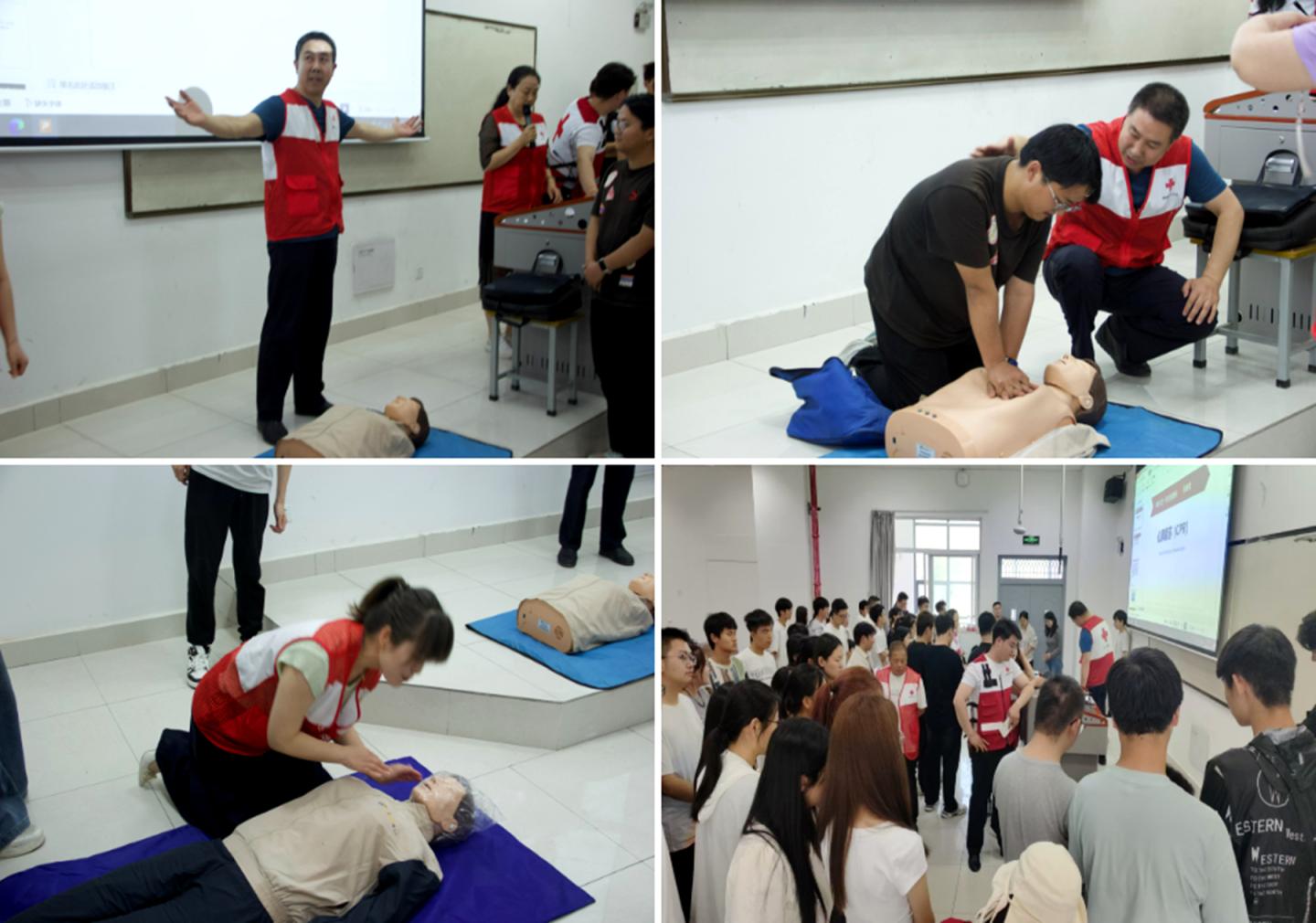培训中,张埔荣结合校园常见场景,围绕CPR急救流程、胸外按压手法及人工呼吸规范等对应急救护和实际救护常用措施进行了系统讲解,强调了“黄金救援四分钟”的重要性。雷蕾带领培训学员梳理了知识重点,并现场组织了理论考试。培训师团队利用模拟人设备演示心肺复苏全流程,重点介绍了按压的位置、手法和力度。在分组练习完成后,学员们均通过培训考核,获得初级救护员证书。